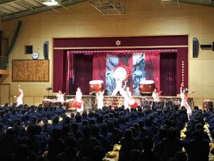 11月15日(金)の5、6時間目に「芸術鑑賞」を体育館で行いました。今年は、「打打打団天鼓」のみなさんが「和太鼓」の演奏を披露してくださいました。