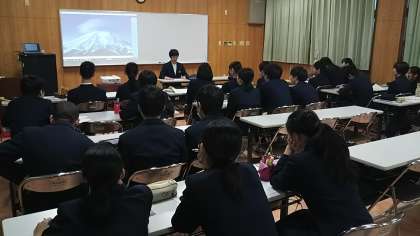 3年生国語科授業のようすです。メディア・リテラシーを取り上げた単元で、生徒自信がニュースキャスターとなり、PowerPointを使って作成した疑似ニュースを授業の中で扱うというものでした。