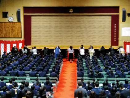 保護者代表の方々より、3年生の先生方に花束が手渡されました。3年間、本当にありがとうございました!そして、担任の先生を先頭に、卒業生が退場しました。