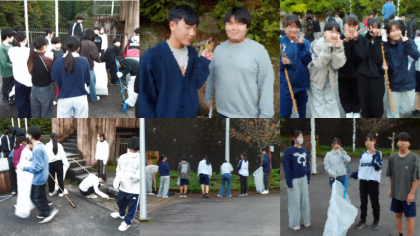 疲れた体を休める暇もなく、次は自然の家でのボランティア清掃です。使わせていただく感謝の気持ちをこめて、来たときよりも綺麗にしようとそれぞれが一生懸命に掃除をしていました。黙々と集中している生徒が多かったのも印象的です。ゴミはもちろん、枯葉や木の枝なども集めて、かなり綺麗な状態にすることができていました。
