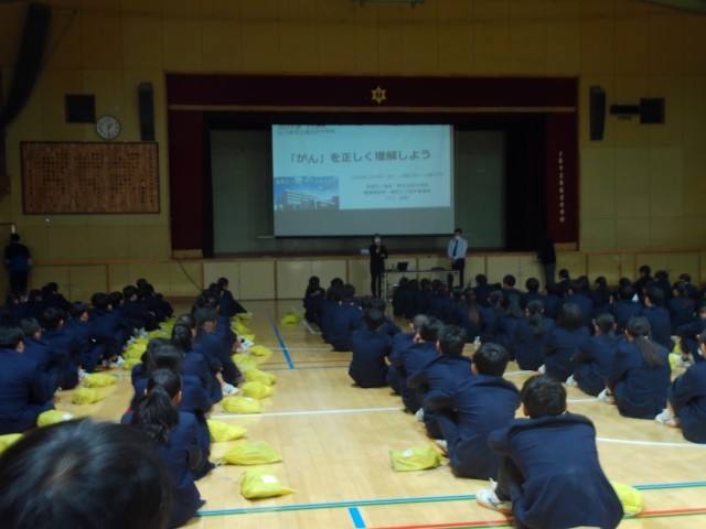 2年生は、16日(金)の5限に看護師の方をお招きして、がんに関する教育を行いました。がんという病気があることを知っている生徒が多かったですが、具体的にどういう病気なのかが分からない生徒も多く、実際がんとはどのような病気なのか詳しく学ぶことができたと思います。かかってしまったらどうなるのか、かからないために出来ることは何なのか、など一つひとつ丁寧に教えていただきました。免疫力は16~20歳の間がピークで、その間の生活習慣が将来にも影響していたり、喫煙や飲酒もがんに罹患する原因であり、中学2年生の現在にがん教育する意味をしっかりと考えてほしいとおっしゃっていました。看護師の方からの貴重なお話に、生徒たちも真剣に聞いている様子でした。