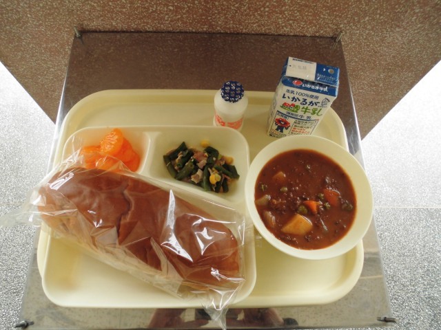 ビーフシチュー、ベーコンとさんどまめのソテー、みかん缶、発酵乳(乳)、黒糖パン、牛乳でした。