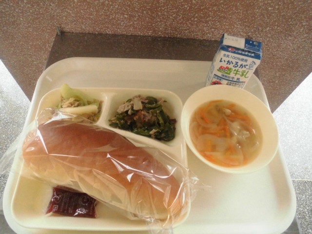 本日の給食のメニューは、豚肉のガーリック焼き、スープ、ツナとキャベツのソテー、いちごジャム、コッペパン、牛乳でした。