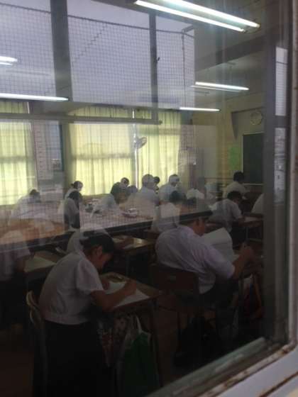9月3日(水)、国、社、数、英、理の順で実力テストを行っています。3年生は懸命に頑張っています。