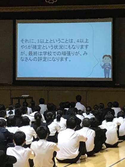 進路指導主事の福田先生のお話を中心に、今年1年間の校内で行われる様々なテストについて、その重要性と心構えを確認しました。1回ではなかなかわからないかもしれませんが、みんな真剣に聞き入っていました。