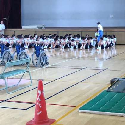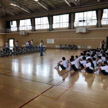 1時間は体育館で、車いすの使い方、操作の仕方などの講義を受けた後、体育館のフロアを道路に見立てて実際に車いすに乗って動かす体験をしました。もう1時間はグループに分かれ、体育館を出て運動場や校舎内の廊下などを、友だちを乗せて、介助体験を行いました。操作に慣れている子もいるようで、ほとんどがスムーズに介助コースを回っていました。全員がバリアフリーについて考え、体験できた時間でした。