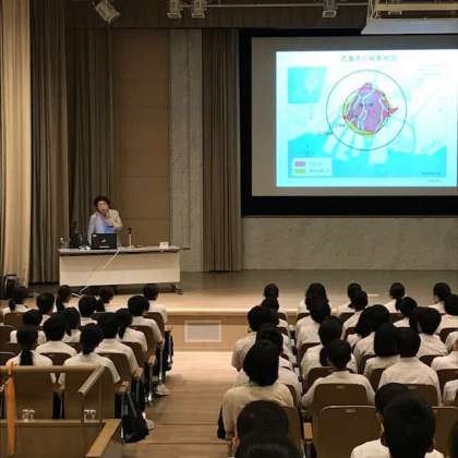 メモリアルホールで、河野さんの話を聞き、平和への尊さを学ぶ。