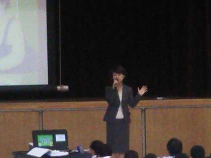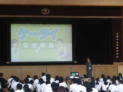 10月4日(土)に中野中学校では情報モラル学習会を体育館でNTTドコモの福村様をお招きして子どもたちに、LINEを中心とした無料通信アプリ、Facebook、TwitterなどのSNSによるトラブルや軽率な使い方は時として大きな責任問題へと発展するため、子どもたちが被害にも加害にもならないようにネットを利用するうえでのルールやマナーについてお話していただきました。