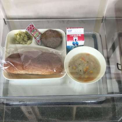 焼きハンバーグ、豆乳スープ、キャベツのカレーソテー