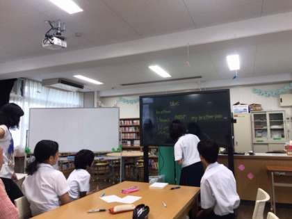 英単語のしりとりなど、楽しみながら単語を覚えたり、チーム対抗で英文を作ったり。