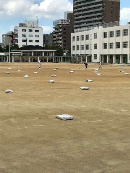 練習のあと、野球部とラグビー部のみなさんに協力してもらって、体育大会に向けての運動場のにがり撒きをおこないました。ありがとうございました。
