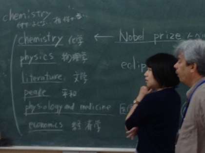 10月11日(土)午後2時より北館1F多目的室で元気アップ学習会 ENJOY!「英活」を行っています。今日は身近にあった出来事を英語を使って(今日は「ノーベル賞」についてなど)ナビゲーターの皆さんと楽しく学習しています。