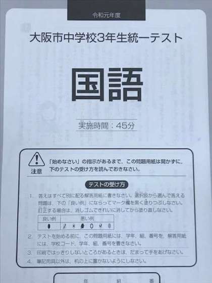 大阪市内の公立中学校で一斉に行われ、答案は教育委員会に送られ、結果は12月に返ってきます。個人の評定に関係する大切なテストです。みんな真剣に取り組んでいます。