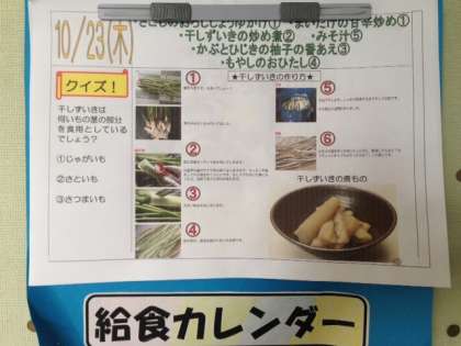 です。干しずいきは何いもの茎を使って作られていますか?下から選んでください。今日の給食カレンダーの問題です。一度考えてみてください。