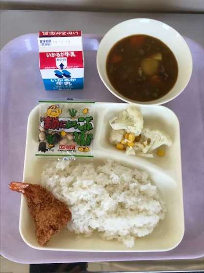 えびフライカレーライス、牛乳、