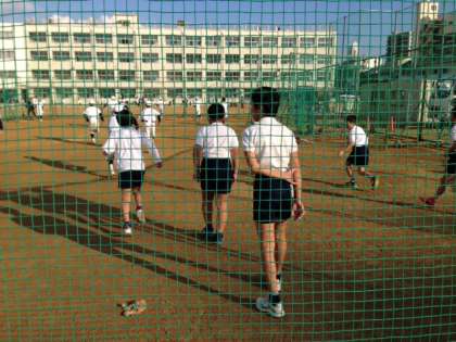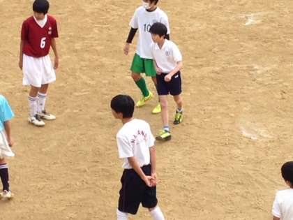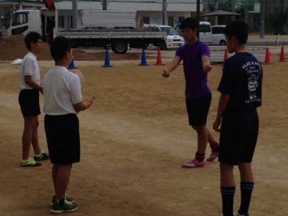 ラグビー部では中学生が児童にパスを教えています。野球部はアップを一緒にしました。サッカー部はポゼッションの練習をしました。