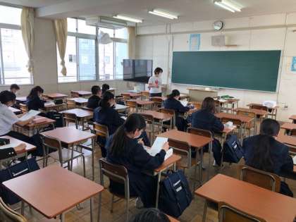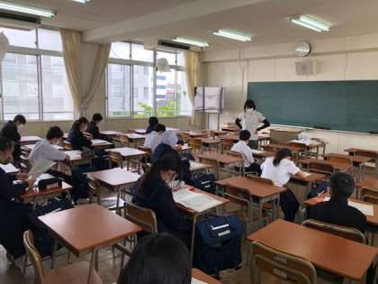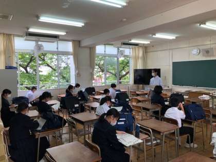 1年生も第3回の登校日でした。毎朝の検温も定着してきて、登校時に報告してくれています。前後半の入れ替わりの時間を使って、先生方で使用教室等の消毒作業もしています。