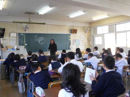 今日の5時間目に、本校の教員が東田辺小学校の6年1組へ訪問して、社会科の出前授業を行いました。「陰陽道」などについて児童のみなさんに授業を行いました。児童のみなさんは真剣に聞いていました。