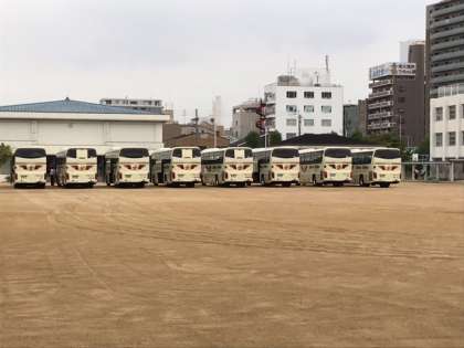 出発式後、10台のバスに分乗。
