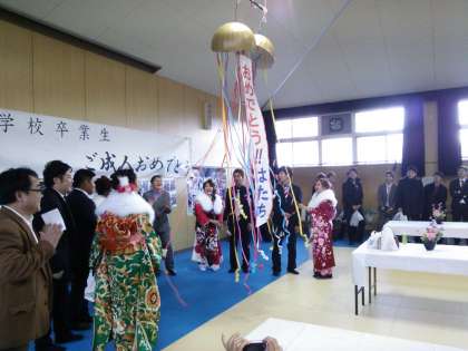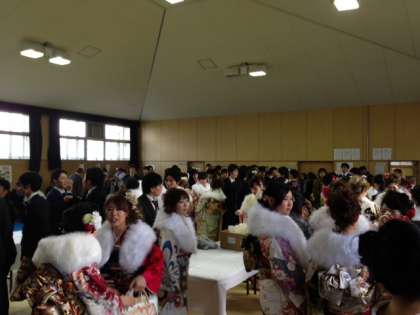 校区4小学校前から新成人を乗せたバスが中学校の武道場へ来て、約200名近くの若人が集まりました。中野中学校の親和会のみなさま・PTA役員のみなさまがみんなを祝福し、当時の校長先生、学年の先生方8名、山本校長先生が駆けつけて、成人のお祝いをしました。元気に、学問に、仕事に励んで、頑張ってください。今日は新成人のみなさん、おめでとうございます。