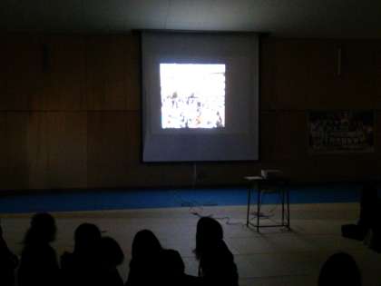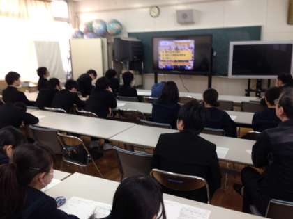 今日の防災講話を3年生はで格技室・図書室・理科室・多目的室で、同時中継できる設備を校長経戦略予算で整えた『プチパブリックビューイング』で聴きました。