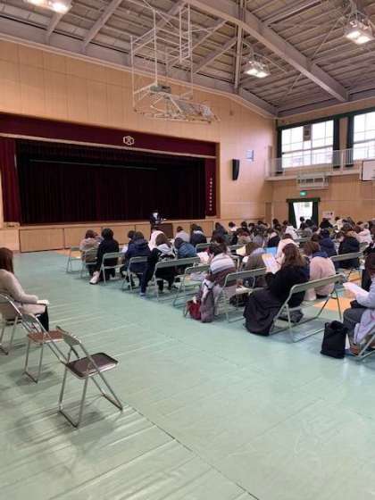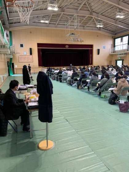 非常事態宣言継続延長の中、感染予防対策を行いながら換気をして、体育館にて入学までの手続きや中学校の様子、事務連絡等を行いました。肌寒い中、ありがとうございました。73期生の入学を心よりお待ちしています。