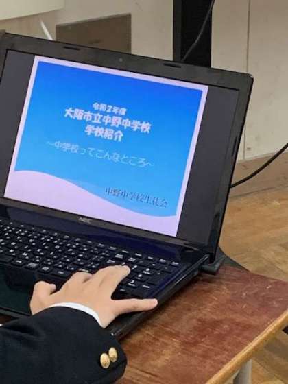 6限目の時間帯を使って、校区4小学校とオンラインでつなぎ、児童会生徒会交流会を行いました。例年であれば、小学6年生を中学校に招いて部活動体験を行ったり、各小学校児童会と中学校生徒会との交流会を中学校で行うのですが、今年度はコロナ禍ということで、リモートで生徒会の生徒が中心となって中学校生活を小学生に紹介するという取り組みになりました。紹介のあと、各小学校の6年生の代表が感想を発表してくれました。
