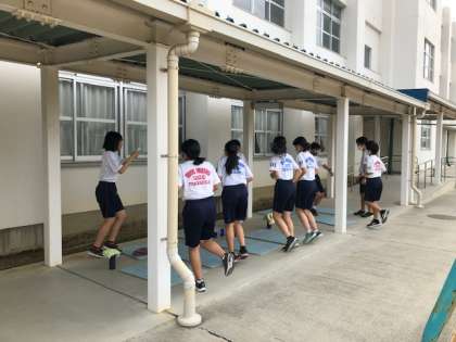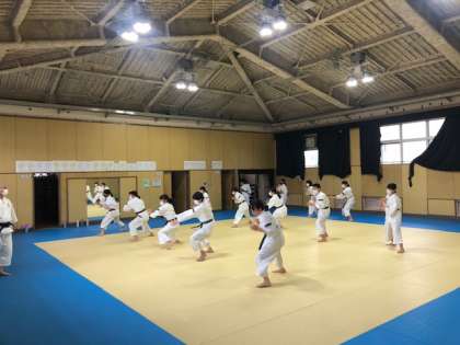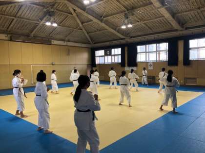 少林寺拳法部は武道場で緊張感をもって練習をしています。陸上部はトレーニングに励んでいました。
