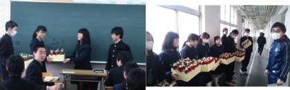3月9日(月)、3年生を送る会を行いました。雨のため、雨天のプログラムで後期生徒会会長の川野君から「お別れの言葉」を述べ、前期生徒会会長の木寺さんから「3年生お別れの言葉」を話しました。その後、2年生の学級代表から3年生の学級代表へPTAのみなさんが造っていただきましたコサージュを贈呈しました。