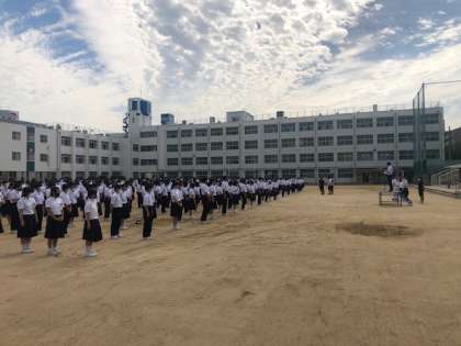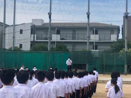 梅雨晴れの中、グラウンドで全校集会を行いました。