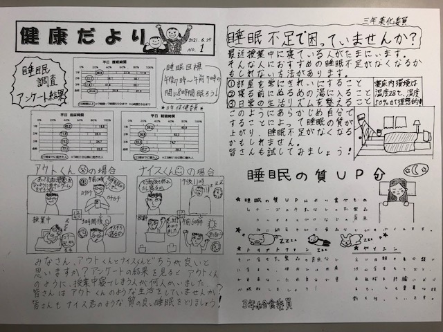 「健康だより」は保健委員会、美化委員会、給食委員会の合同で作成しました。今回は睡眠調査アンケート結果より、睡眠不足で授業中に眠らないためにも、睡眠の質UPの方法が掲載されています。丁寧にまとめられた、とても読みやすいプリントになりました。