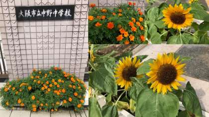 中野中学校正門の入口には鮮やかなオレンジ色したマリーゴールドとミニ向日葵がお出迎えいたします。本校管理作業員さんが育ててくれました。ご来校の際、足を止めてご覧ください。