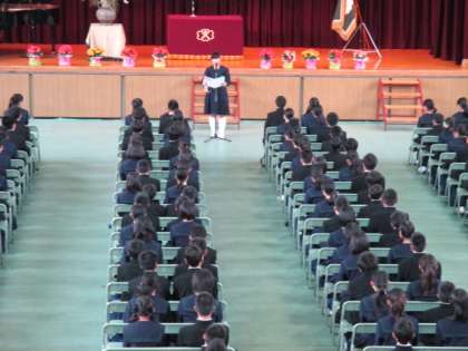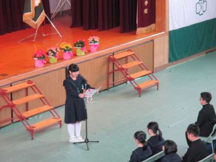 在校生を代表して生徒会会長の皆笹さんが歓迎のことばを新入生へ、新入生を代表して松田さん、真鍋さんが思いを話しました。