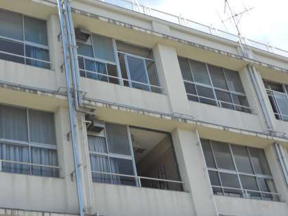 現在、上の写真のように東館3階・4階の各教室に消防用の非常用進入口の工事が行われています。