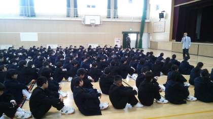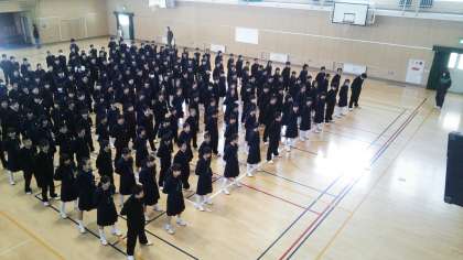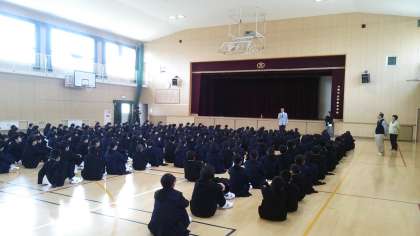 22日朝 1年生は体育館で初めての学年集会です。