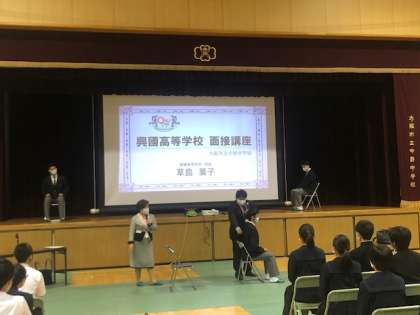 3年生は5・6限を使って興國高等学校の校長草島葉子先生に面接講座の講演をしていただきました。現役の3年生も来校して、自分たちの経験を元に面接の仕方などを教えてくれました。最後は実践練習をしました。緊張感もある中、よく頑張りました。実際の面接でいかせるように今日教わったことを忘れずに自分のものにしてください。