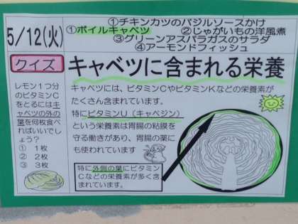 本日の給食カレンダーは「キャベツに含まれる栄養」についてです。ボイルキャベツをおいしく食べましたか?
