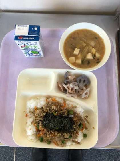 ごはん、牛乳、鶏ごぼうご飯、みそ汁、焼きれんこん