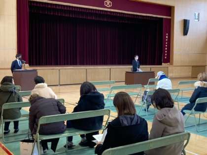 コロナ対策もあり、風の吹き抜ける体育館の中でしたが、多くの保護者の皆様にご参加いただきました。ありがとうございました。桜満開の中野中学校ご入学に向けて準備にご協力お願いいたします。