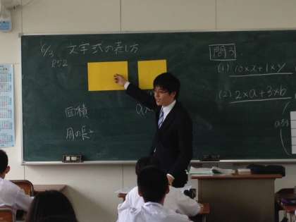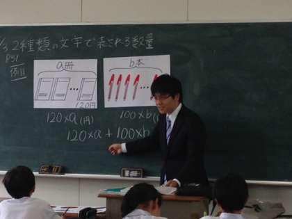 6月3日(水)の3時間目、1年2組で楠本賢太実習生の数学の「文字の式」の研究授業を行いました。子どもたちは「文字の式」を理解しようと勉強に励んでいました。