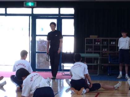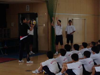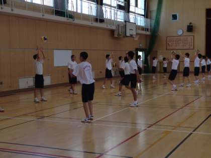 いよいよ教育実習も残り2日となりました。6月4日(木)の1時間目に上田一貴実習生による2年4組・5組の男子体育の研究授業が行われました。オーバーハンドパス、アンダーハンドパスの練習を仲間と協力しながら教え合いながら練習することを取り組みました。