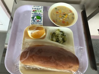 コーンクリームシチュー・キャベツときゅうりのサラダ・かわちばんかん・パン・牛乳