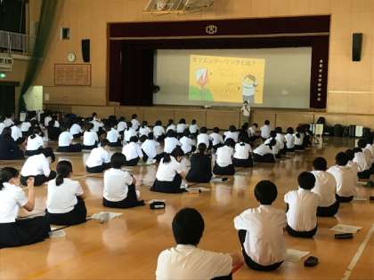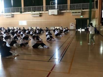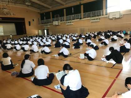1年生は、一泊移住のオリエンテーリングの説明を、3年生のカバンでいっぱいの体育館で聞いています
