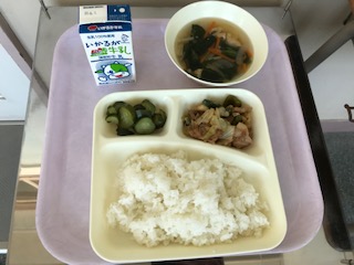 ホイコウロー・鶏肉と野菜の中華スープ・きゅうりのピリ辛あえ・ごはん・牛乳