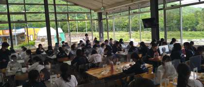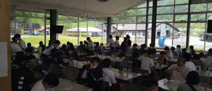昼食の様子です。現在、体調不良の生徒は出ていないとのことです。天候も晴れ。午後からはいよいよラフティングです。