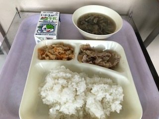 豚肉の甘辛焼き・もずくとオクラのとろり汁・切干しだいこんのいため煮・ごはん・牛乳