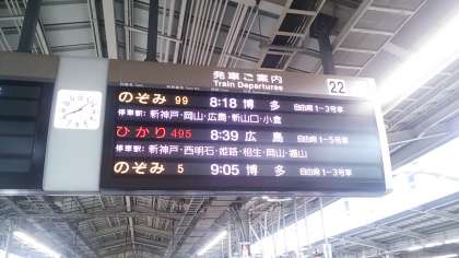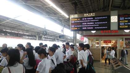 子どもたちは午前8時18分発ののぞみ99号に乗って博多駅へ向かいます。停車時間は1分30秒、昨日の乗車の練習を思い出して、さあ乗り遅れるな!