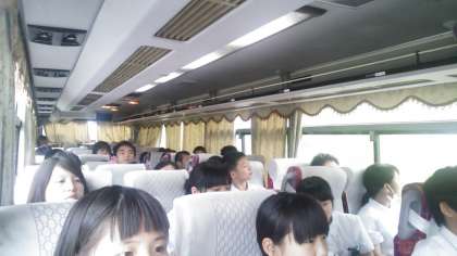 バスレクで盛り上がった後、原爆資料館まであと1時間となりました。バスガイドさんから「平和についてのご講話」をしていただいています。子どもたちは真剣に聞いています。