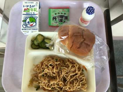 オイスターソース焼きそば・きゅうりのピリ辛あえ・ソフト黒豆・発酵乳・パン・牛乳