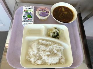 ビーフカレーライス・野菜のピクルス・ぶどうゼリー・ごはん・牛乳
